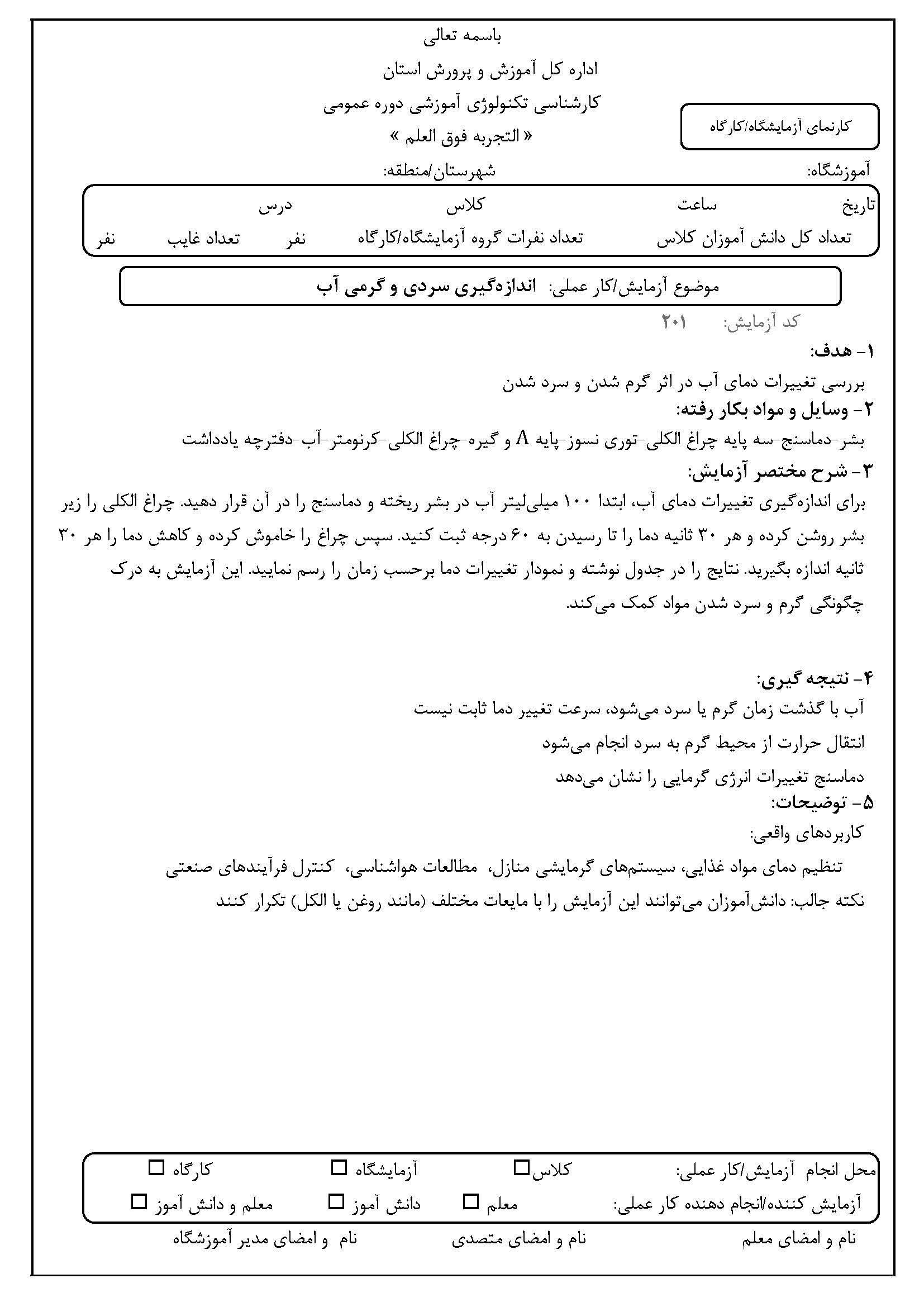 گزارش کار این آزمایش طبق کار عملی و به صورت کامل و مرحله به مرحله در قالب یک فایل پی دی اف PDF دو صفحه ای آماده شده است.  که نمونه رایگان آن را (برای آزمایش کد 201)  در تصاویر زیر مشاهده می کنید.