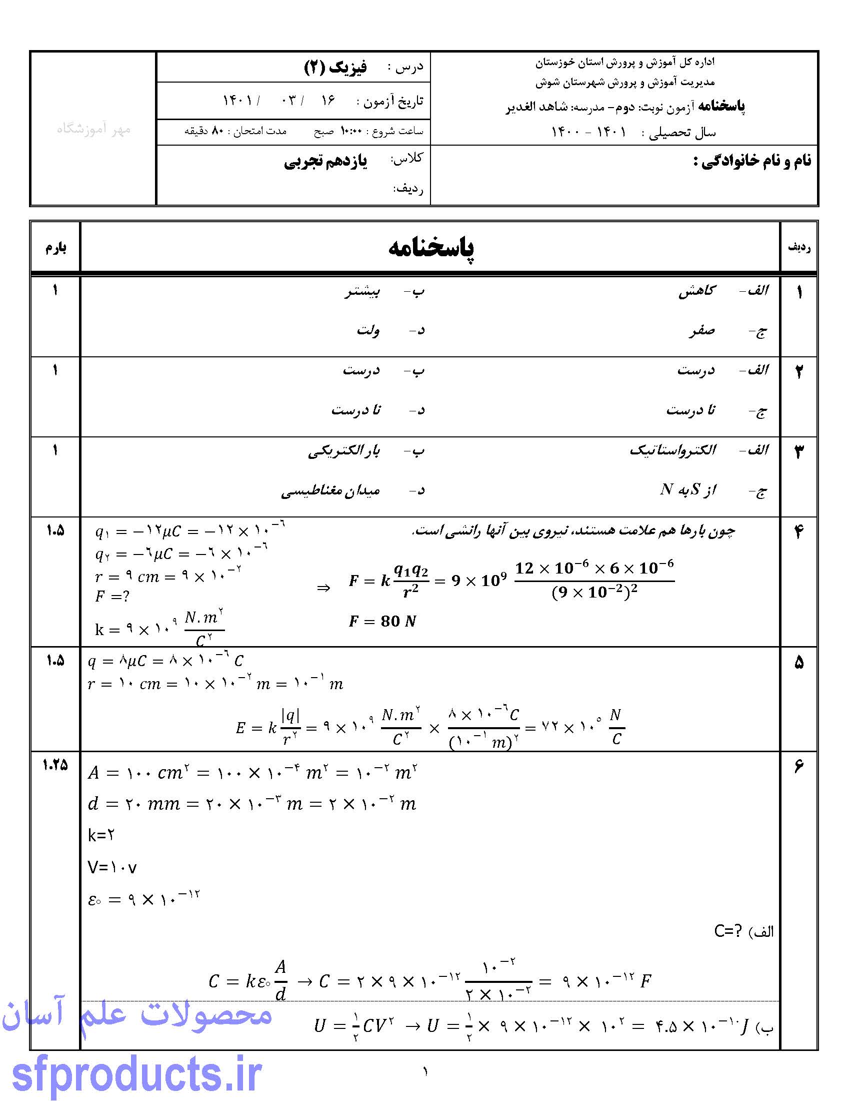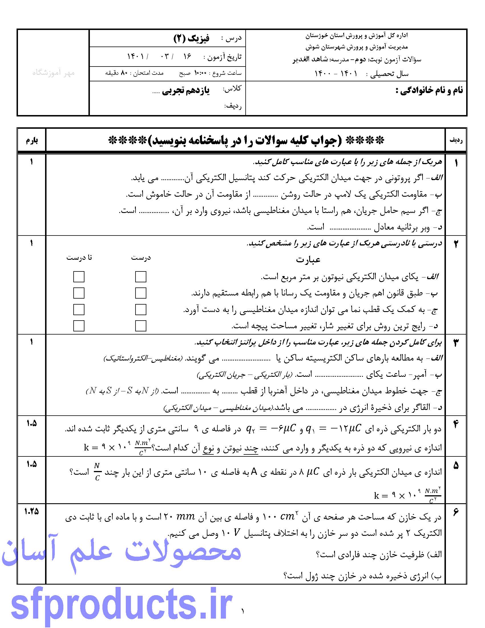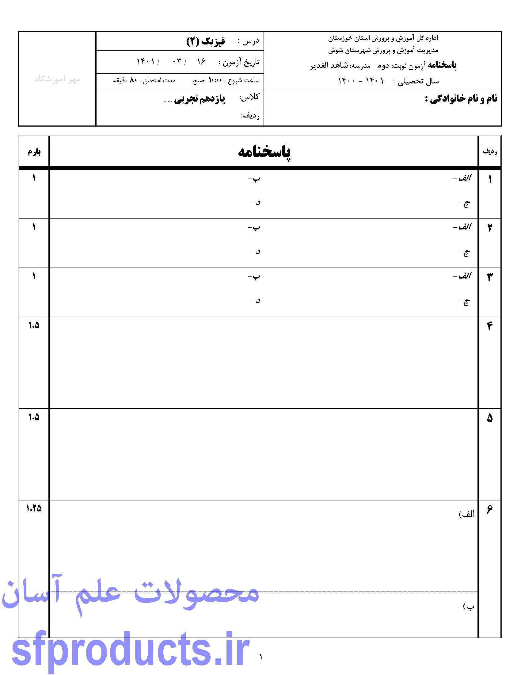 برای دیدن دیگر نمونه سوالات مرتبط با فیزیک یازدهم این صفحه را ببینید.