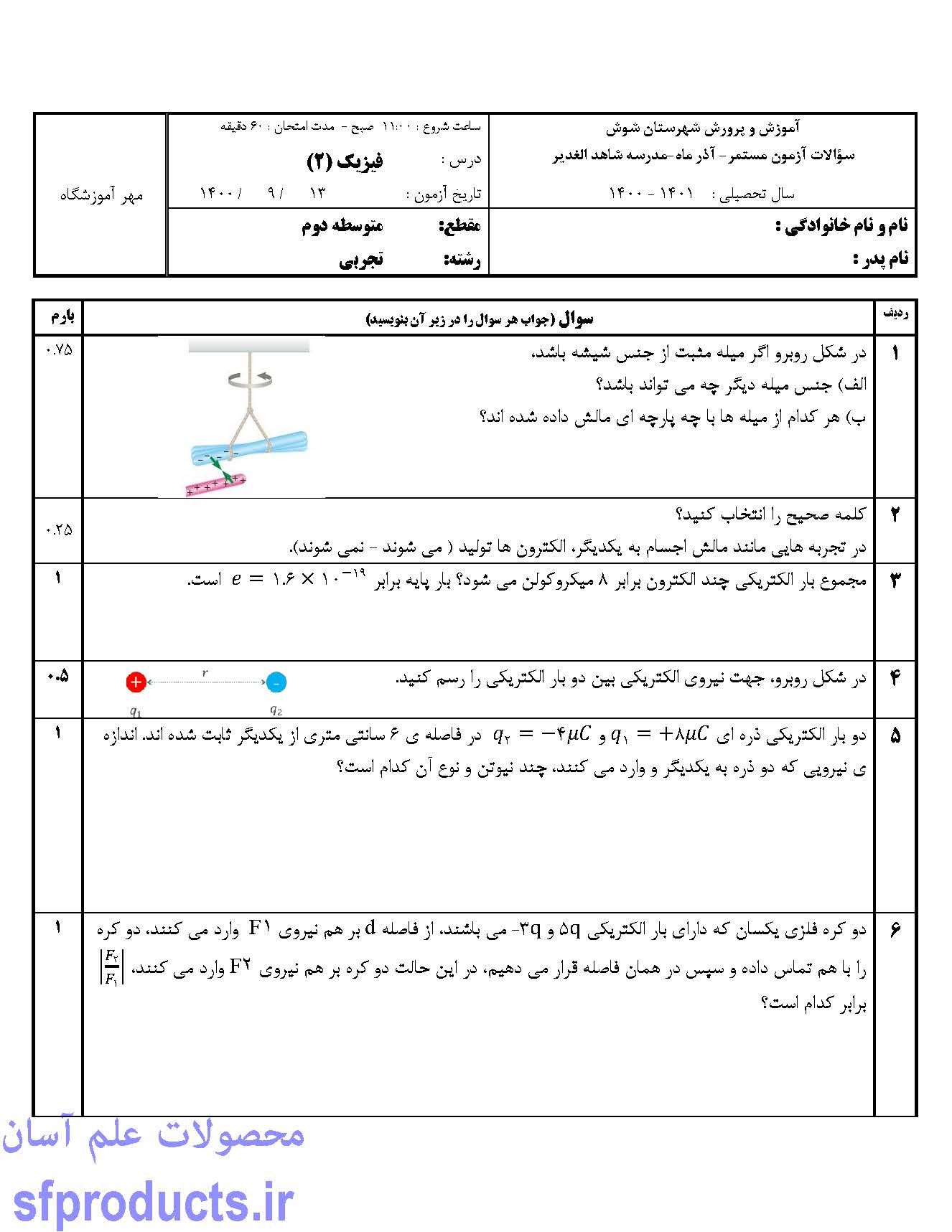 نمونه سوال امتحان مستمر فیزیک یازدهم تجربی برای آذرماه شامل 3 صفحه سوال آماده و قابل ویرایش در برنامه آفیس ورد می باشد با دانلود رایگان PDF